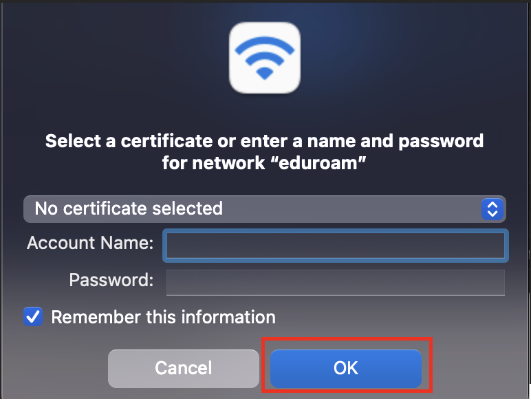 If it prompts you to type in a username and password after the certificate portion, this would be your personal computer username and password. Other than that, congratulations! You are now connected to eduroam. The wifi should not prompt you to re-enter your password unless you changed your password recently.